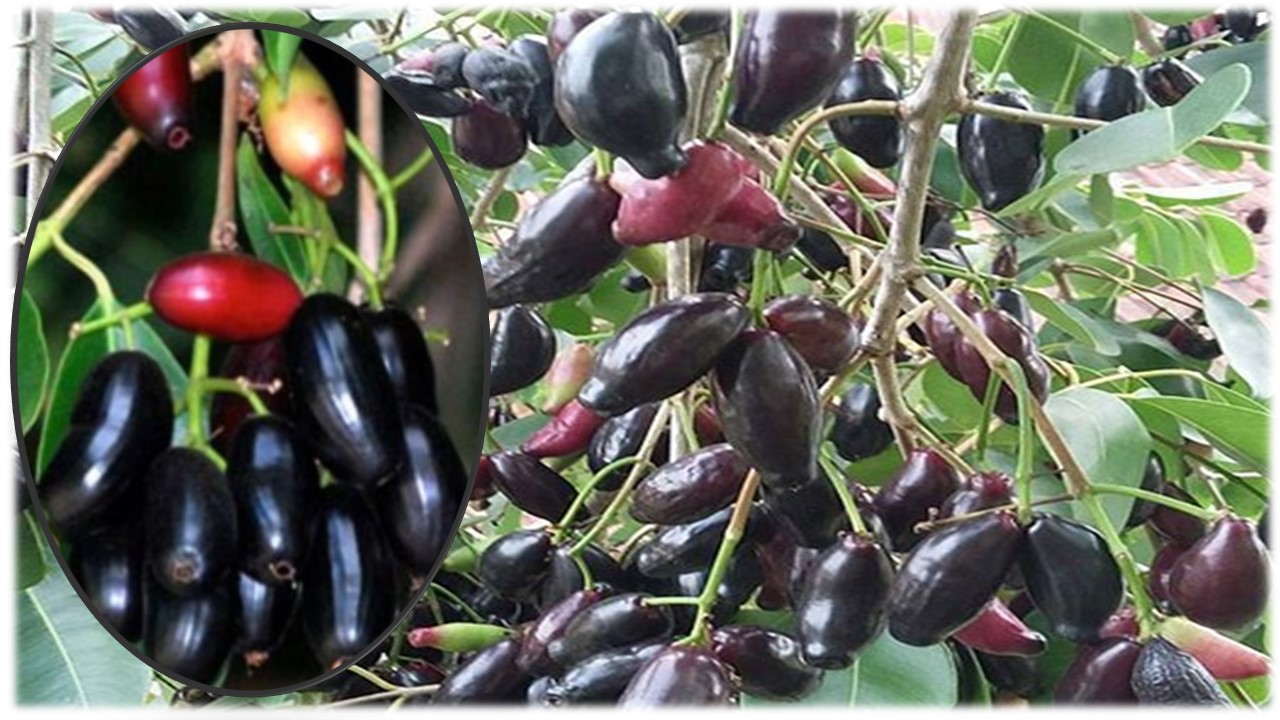 Syzygium cumini. Pohon buah ini memiliki tinggi mencapai 10-20 m, berbatang