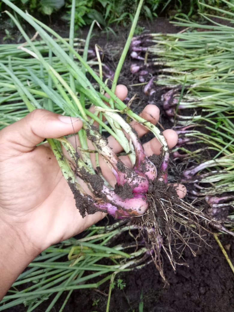 Setelah tanaman menunjukkan tanda-tanda daun mulai menguning dan tanaman berumur 2,5-3 bulan dan umbi sudah besar, tanaman sudah siap dipanen.
