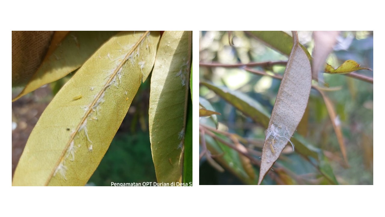 Kutu loncat hidup bergerombol dan menyerang pucuk daun yang masih muda dengan cara menghisap cairan pada tulang-tulang daun sehingga daun berbintik-bintik berwarna kuning kecoklatan, daun keriting berlubang dan berukuran tidak normal, kerdil, pertumbuhannya terhambat, bahkan bunga dan buah dapat mengalami kerontokan. Setelah menghisap cairan daun, kutu ini mengeluarkan cairan getah bening yang pekat rasanya manis dan merata ke seluruh permukaan daun sehingga mengundang semut-semut bergerombol hingga menyebabkan munculnya cendawan embun jelaga berwarna hitam yang terdapat dipermukaan daun dan buah. Cendawan ini dapat mengganggu proses fotosintesis dan pertumbuhan tanaman. Pada serangan berat dapat menghambat pertumbuhan tanaman dan menurunkan kualitas buah, sehingga hasil panen tidak maksimal. Kutu loncat selama perkembangannya mempunyai tiga stadia hidup yaitu telur, nimfa dan dewasa. Telur biasanya diletakkan secara tunggal atau berkelompok pada kuncup dan tunas-tunas muda. Kutu loncat durian tertarik pada tunas-tunas muda sebagai tempat peletakan telur, sehingga pertunasan tanaman merupakan faktor penting dalam perkembangbiakannya.