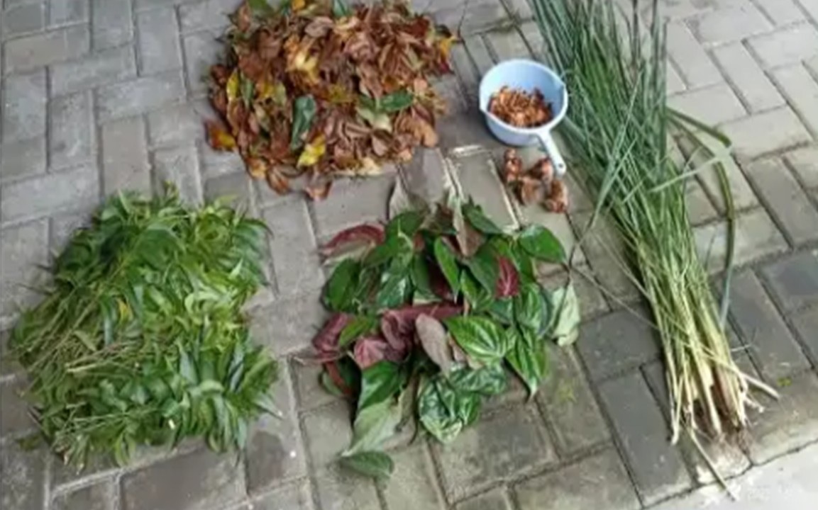 bahan daun mimba, daun cengkeh, sereh wangi, daun sirih, lengkuas masing-masing