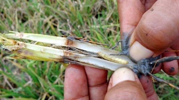 Sedangkan ketika larva sudah masuk ke dalam batang, maka larva akan merusak pembuluh bagian dalam batang. Sehingga batang putus dan saat dicabut mudah terlepas. Larva penggerek batang dapat dengan mudah dikenali ketika berada di dalam batang.