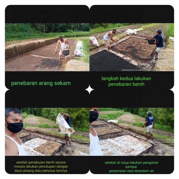 3. Tebarkan benih padi, setelah benih ditebar kemudian ditutup menggunakan daun pisang atau penutup lainnya .( Benih yang digunakan untuk luas lahan sekitar 1 ha yaitu 20-25 kg benih).