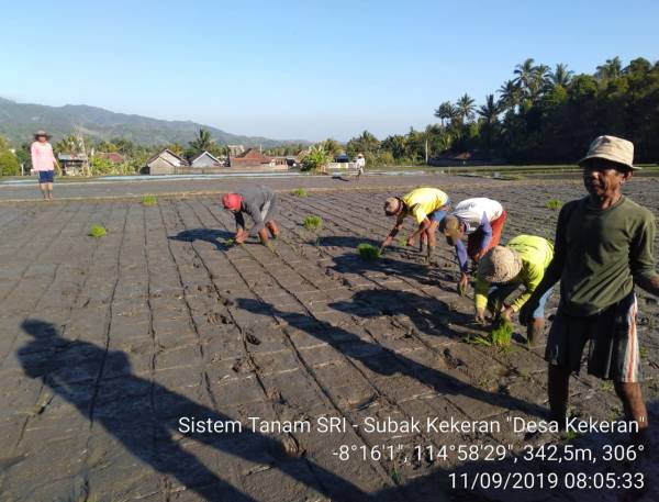 Penanaman SRI kali ini berlokasi di lahan milik Bapak Darmaya (Subak Kekeran - Desa Kekeran), sebagai demplot adaptasi teknologi spesifik lokalita seluas 0,5ha. Didampingi langsung oleh PPL Wilbin (drh. I Gusti Lanang Made Suyasa) dan Kelian Subak Kekeran. Berbeda dengan penanaman semestinya, dengan metode SRI dirasakan lebih susah oleh sekaa memula (tukang tanam) karena mesti membuat garis dengan caplak (alat konvensional) dengan ukuran 30cm x 30cm agar tegak lurus dan untuk penanaman mesti berjalan ke depan. Untuk penanam pemula memang dirasa agak sulit, karena terbiasa menanam dengan berjalan mundur.