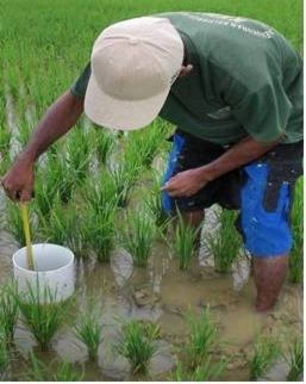 Pipa berlubang sebagai alat bantu Pipa paralon (PVC) bisa digunakan sebagai alat teknologi PBK untuk mengamati air di bawah permukaan. Pipa bisa diganti dengan bahan lain seperti bambu atau bahan lainnya. Banyaknya alat yang diperlukan tergantung pada tofografi lahan, satu alat bisa mewakili luasan 500 m2, sedangkan pada kemiringan 3 – 5% satu unit alat mewakili 100 m2. Pipa berukuran 35 cm dibenamkan sedalam 20 cm, sehingga tinggi pipa dari permukaan tanah adalah 15 cm, kemudian tanah di dalam pipa dikeluarkan. Untuk tahapan pengkajian atau uji coba, petani memonitor/mengukur kedalaman air di dalam pipa setiap interval waktu 2 hari dan melakukan teknik basah kering (pengairan lahan sawah) sesuai dengan prinsif PBK. Setelah petani percaya PBK tidak menurunkan hasil secara nyata, pipa yang dibenamkan cukup 15 cm sesuai dengan PBK aman dan tidak perlu lagi mengukur dengan mistar. Petani pun bisa mencoba mengubah batas PBK aman yakni dengan menambah batas kedalaman muka air untuk diairi misalnya 20 cm, 25 cm, dan 30 cm.