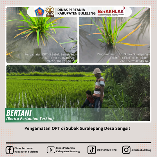 Rabu, 29 Oktober 2025 telah dilaksanakan pengamatan OPT/DPI pada Tanaman Padi di Subak Suralepang Desa Sangsit Kecamatan Sawan. Kegiatan ini dilakukan oleh PPL Wilbin Desa Sangsit bersama POPT Kecamatan Sawan bersama Kelian Subak Suralepang di lahan milik Bapak Made Arta dan lahan disekitarnya.