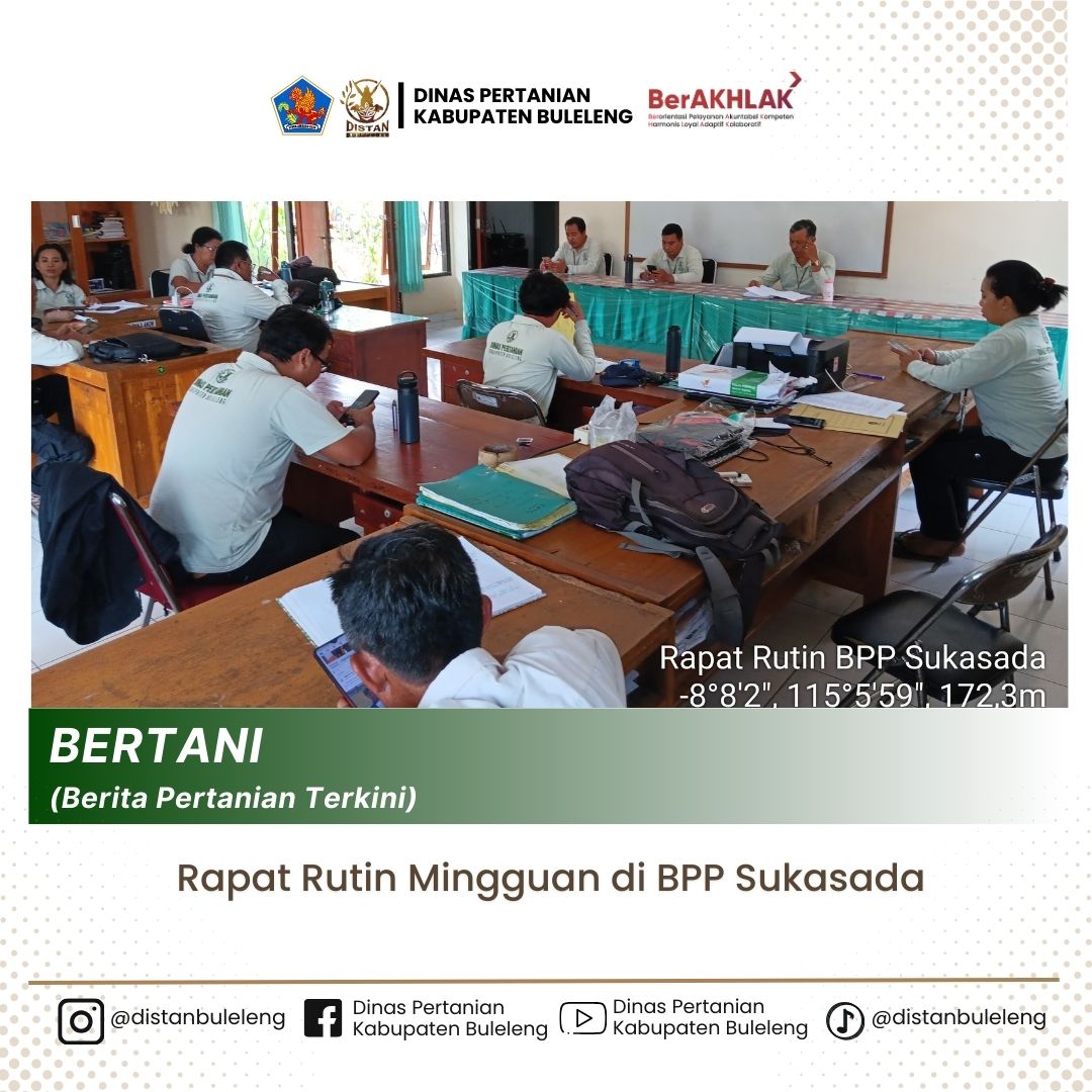 Rabu, 16 April 2025 telah dilaksanakan rapat rutin mingguan bertempat di Ruang Pertemuan BPP Sukasada yang dipimpin oleh Koordinator P2K dan dihadiri oleh seluruh petugas pertanian BPP Sukasada.