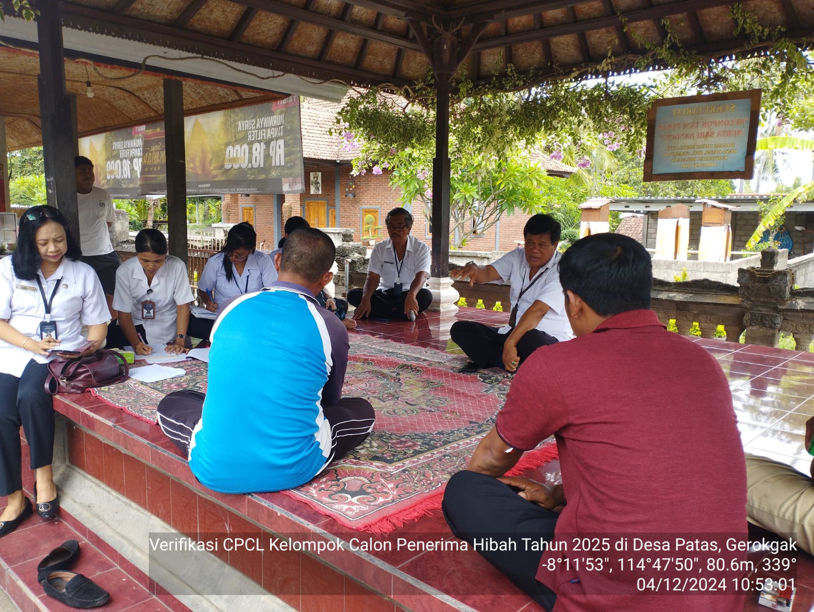 Kelompok calon penerimah hibah yang diverifikasi adalah Kelompok Tani Taman Merta Sari Nandini yang berlokasi Desa Patas, Kec. Gerokgak. Proses verifikasi didampingi oleh PPL wilayah binaan Desa Patas yang dimulai dengan pemaparan data penerima hibah yang telah diajukan oleh berbagai kelompok, baik itu kelompok masyarakat, maupun institusi pemerintah daerah. Tim verifikasi kemudian memeriksa kelengkapan dokumen, legalitas kelompok, RAB usulan dan kesesuaian tujuan hibah dengan program yang sudah direncanakan. Verifikasi CP/CL ini diharapkan dapat meminimalisir adanya potensi kesalahan administrasi dan penyalahgunaan dana hibah agar bantuan yang diberikan juga tepat sasaran.