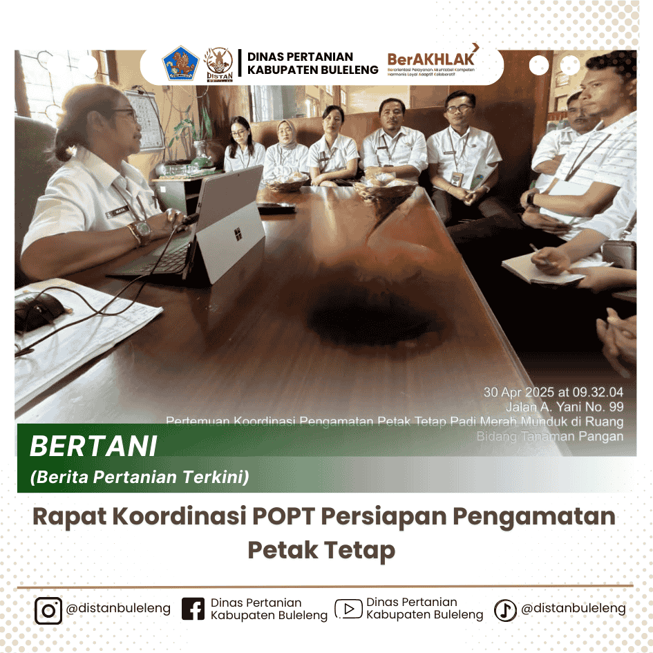 Rabu 30 April 2025, pelaksanaan pertemuan koordinasi petugas POPT (Pengendali Organisme Pengganggu Tumbuhan) Kecamatan, terkait kegiatan pengamatan petak tetap padi merah Munduk di lahan eks Hutan Kota, yang rencananya akan dimulai Kamis 1 Mei 2025 dan dilakukan setiap minggu.
