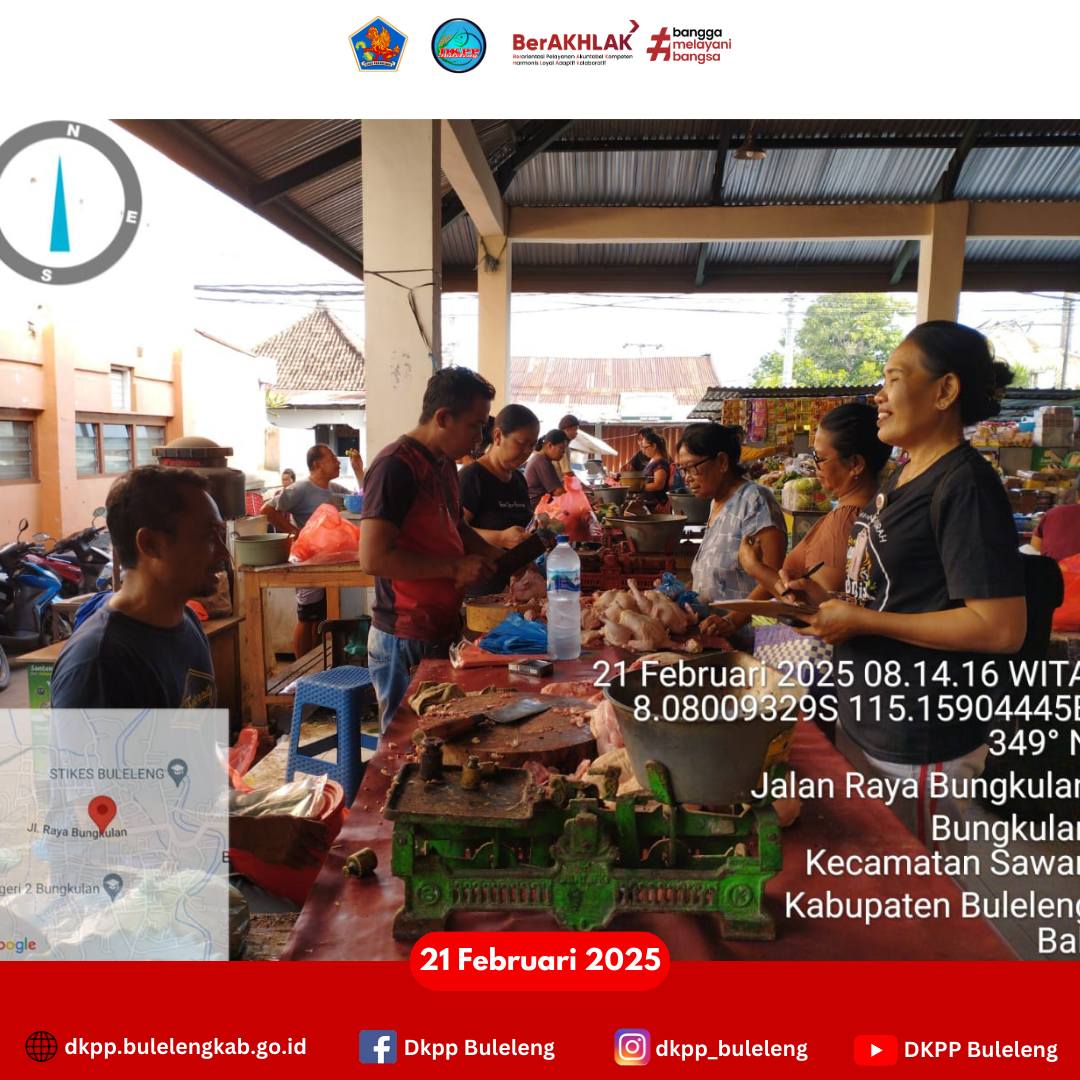 Jumat, 21 Februari 2025 - Dinas Ketahanan Pangan dan Perikanan (DKPP) Kabupaten Buleleng melalui Distribusi dan Cadangan Pangan melaksanakan pemantauan harga bahan pangan pokok di Pasar Desa Bungkulan dan Penggilingan Beras (PB) Suwela, Kecamatan Sawan.
