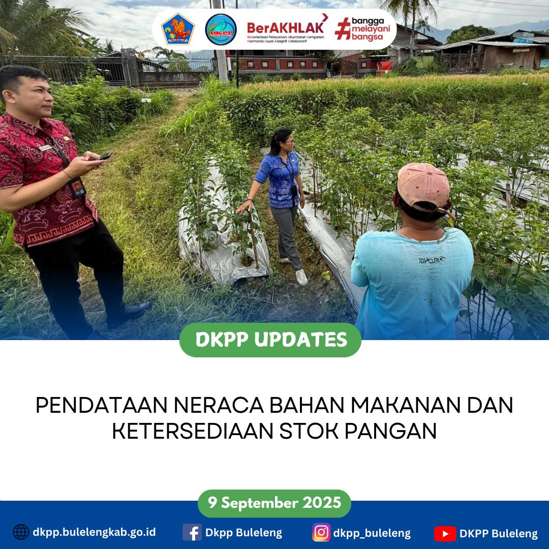 Selasa, 9 September 2025 - Dinas Ketahanan Pangan dan Perikanan (DKPP) Kabupaten Buleleng melalui Bidang Ketersediaan dan Kerawanan Pangan melaksanakan Pendataan Neraca Bahan Makanan dan Ketersediaan Stok Pangan, dengan menyasar komoditas pangan yang memiliki potensi terhadap kenaikan harga yang dikembangkan oleh masyarakat/pelaku usaha di desa Bebetin dan desa Sekumpul. Kegiatan ini dilaksanakan oleh Analis Ketahanan Pangan Ahli Madia (Ni Made Atmadewi, SP., MAP) beserta staf terkait yang didampingi aparatur desa setempat.