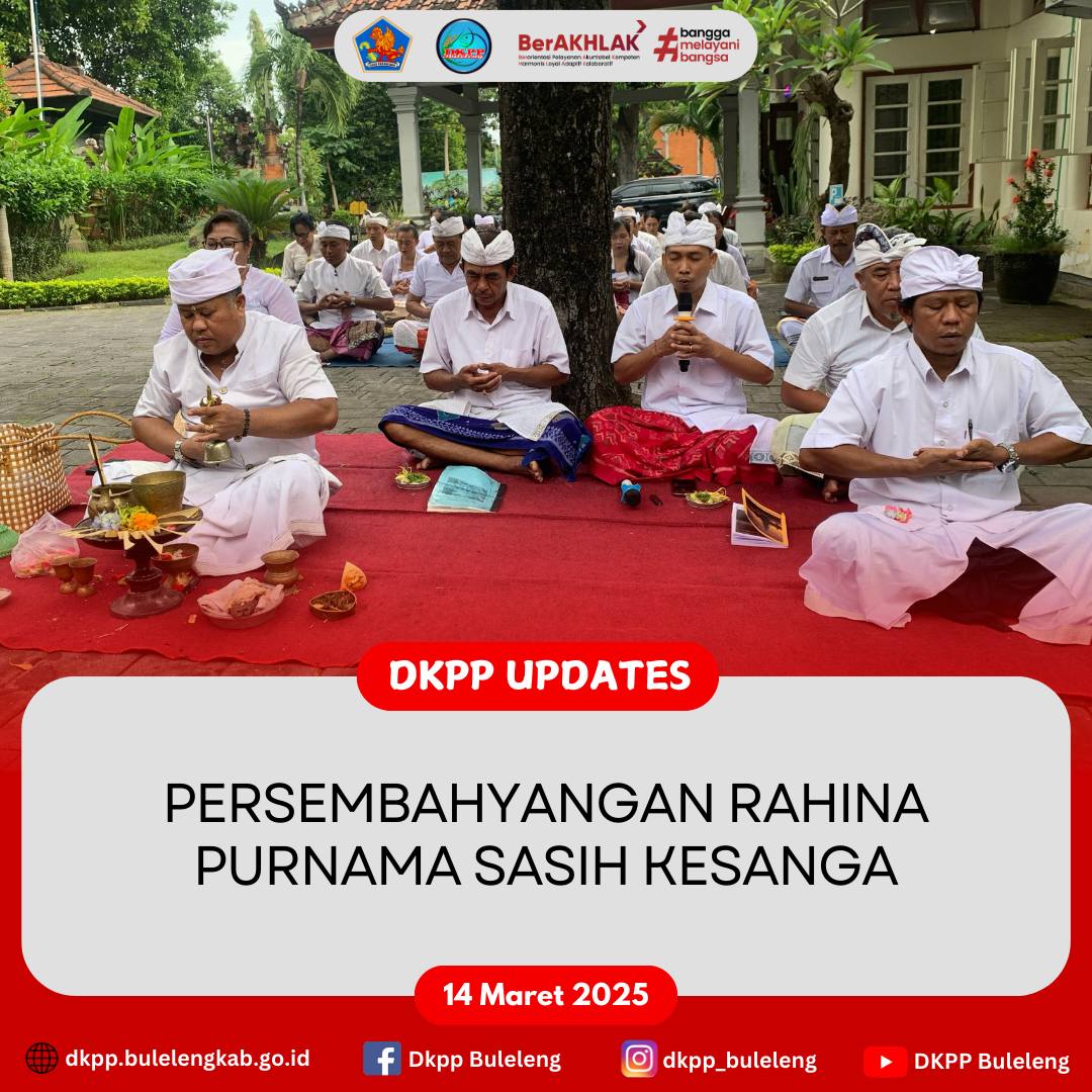 Sukra, 14 Maret 2025 - Persembahyangan bersama jajaran Dinas Ketahanan Pangan dan Perikanan (DKPP) Kabupaten Buleleng yang bertepatan dengan Rahina Purnama Sasih Kesanga. Purnama Kesanga yaitu bulan Purnama yang muncul pada bulan kesembilan dalam perhitungan kalender Bali Saka.