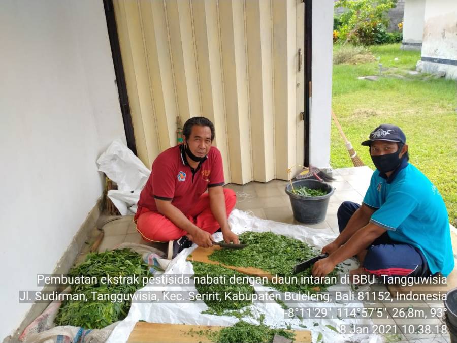 Pestisida nabati dibuat dari bahan-bahan yang tersedia di alam merupakan pemecahan jangka pendek untuk mengatasi masalah hama dengan cepat. Pestisida alami harus menjadi bagian dari sistem pengendalian hama terpadu dan hanya digunakan bila diperlukan (tidak digunakan jika tidak terdapat hama yang merusak tanaman) Hari Jumat 8 Januari 2021 pestisida nabati (pesnab) yang dibuat di BBU Tangguwisia oleh Kasi Perbenihan dan Perlindungan berserta staf BBU, staf BPP dan PPL Wilbin Desa Kalianget adalah dari bahan daun Mimba.