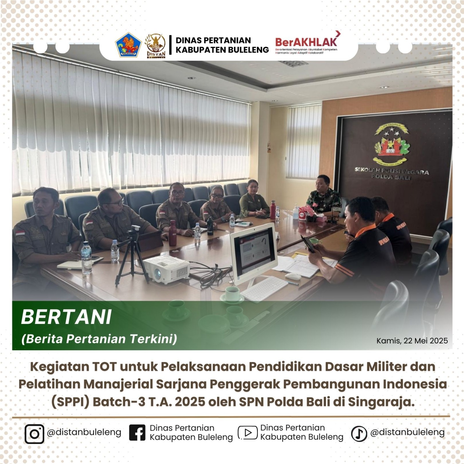 Kegiatan TOT ini dilaksanakan di SPN Polda Bali, Singaraja, dan diikuti oleh para pelatih, pendamping, dan tenaga pendidik yang pada kesempatan kali ini yaitu TIM dari Dinas Pertanian Kabupaten Buleleng nantinya akan berperan penting dalam membina para peserta SPPI. Materi pelatihan yang nantinya akan dijarkan yaitu bertema Tani Nusantara yang dimana merupakan kegiatan pertanian dengan pendekatan kembali ke alam.