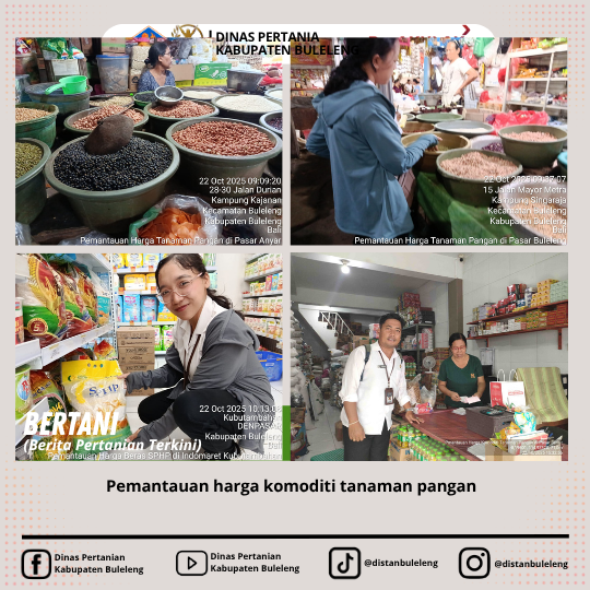 Rabu 22 Oktober melaksanakan kegiatan pemantauan harga komoditi tanaman pangan di Pasar Anyar, Pasar Banyuasri, Pasar Buleleng dan Pasar Seririt oleh PMHP dan Petugas Informasi Pasar (PIP) di Bidang Tanaman Pangan. Pemantauan harga komoditi tanaman pangan adalah kegiatan mengumpulkan data harga dan pasokan untuk menjaga stabilitas harga, melindungi konsumen, dan membantu pemerintah merumuskan kebijakan. Informasi harga pasar yang diperoleh dari pemantauan ini penting untuk mendeteksi dini gejolak harga dan memastikan ketersediaan pangan, serta dapat menjadi dasar untuk pengambilan keputusan bagi pemerintah dan pelaku usaha. Pemantauan dilakukan setiap minggu sekali untuk dapat memberikan informasi terkait