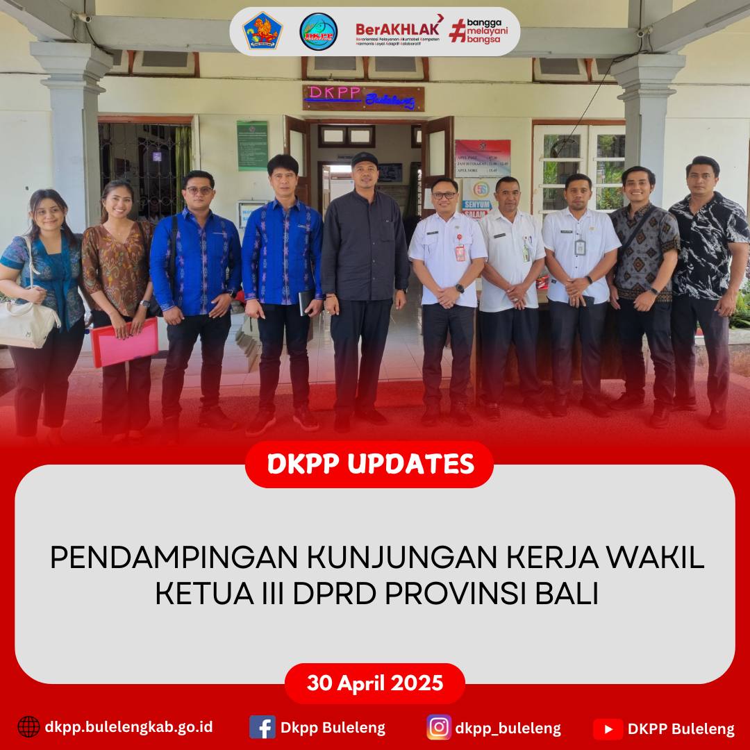 Rabu, 30 April 2025 - Sekretaris Dinas Ketahanan Pangan dan Perikanan Kabupaten Buleleng Ariston Adhi Pamungkas, S.P., M. Env Man. dalam hal ini mewakili Kepala Dinas bersama Pengelola Produksi Perikanan Tangkap melakukan pendampingan terhadap kegiatan kunjungan kerja Wakil Ketua III DPRD Provinsi Bali I Komang Nova Sewi Putra, S.E. bersama jajarannya. Kunjungan ini bermaksud untuk berkoordinasi mengenai implementasi Perda Provinsi Bali Nomor 11 Tahun 2017 tentang Bendega, khususnya dalam bidang pembinaan, pengawasan dan pemberdayaan Bendega.