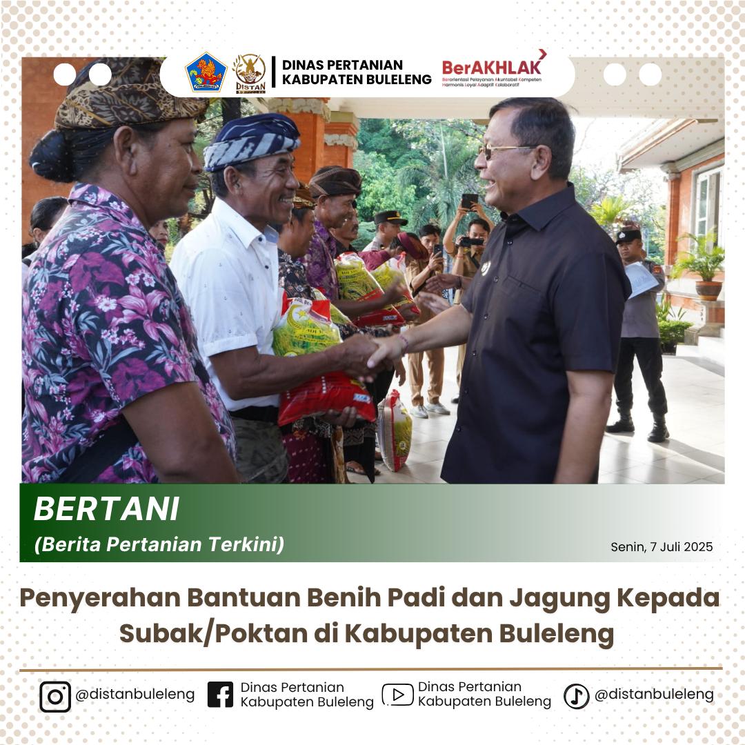 Dalam upaya mendukung ketahanan pangan dan meningkatkan produktivitas pertanian di Kabupaten Buleleng, Pemerintah Kabupaten Buleleng melalui Dinas Pertanian menyerahkan bantuan benih padi kepada sejumlah Subak dan Kelompok Tani (Poktan) yang tersebar di berbagai kecamatan. Penyerahan bantuan ini secara simbolis dilakukan langsung oleh Bupati Buleleng kepada perwakilan petani pada acara yang digelar di Halaman Kantor Bupati Buleleng pada tanggal 7 Juli 2025