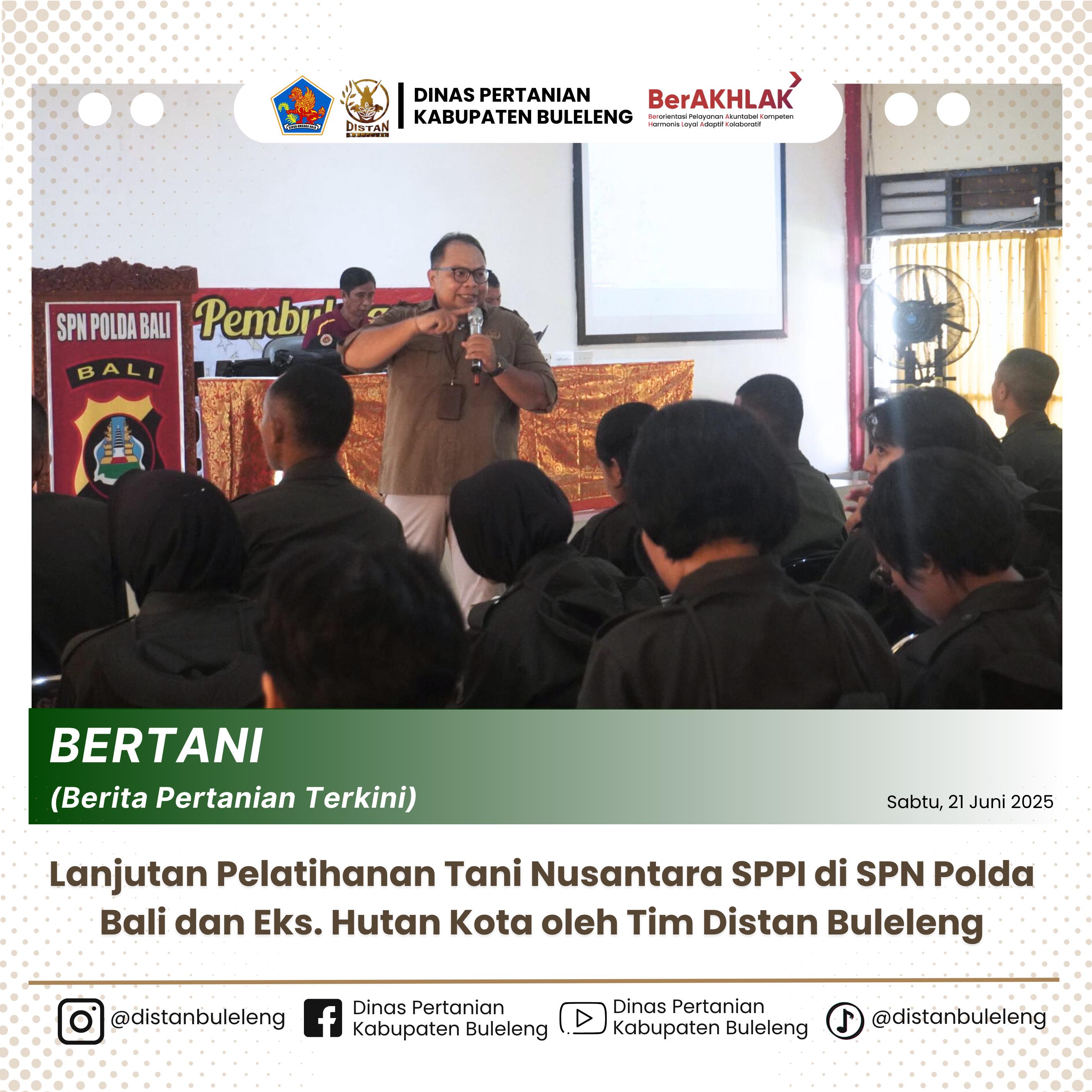 Singaraja, 21 Juni 2025. Dinas Pertanian Kabupaten Buleleng Kembali melanjutkan program Unggulann Pelatihan Majerial Tani Nusantara, yang kali ini focus pada inovasi irigasi hemat air. Acara berlangsung di Ruang Saraswati, Sekolah Penggerak Negri (SPN) Singaraja, dengan materi utama yang disampaikan oleh Kepala BidangPSP Made Siladharma, S.TP.