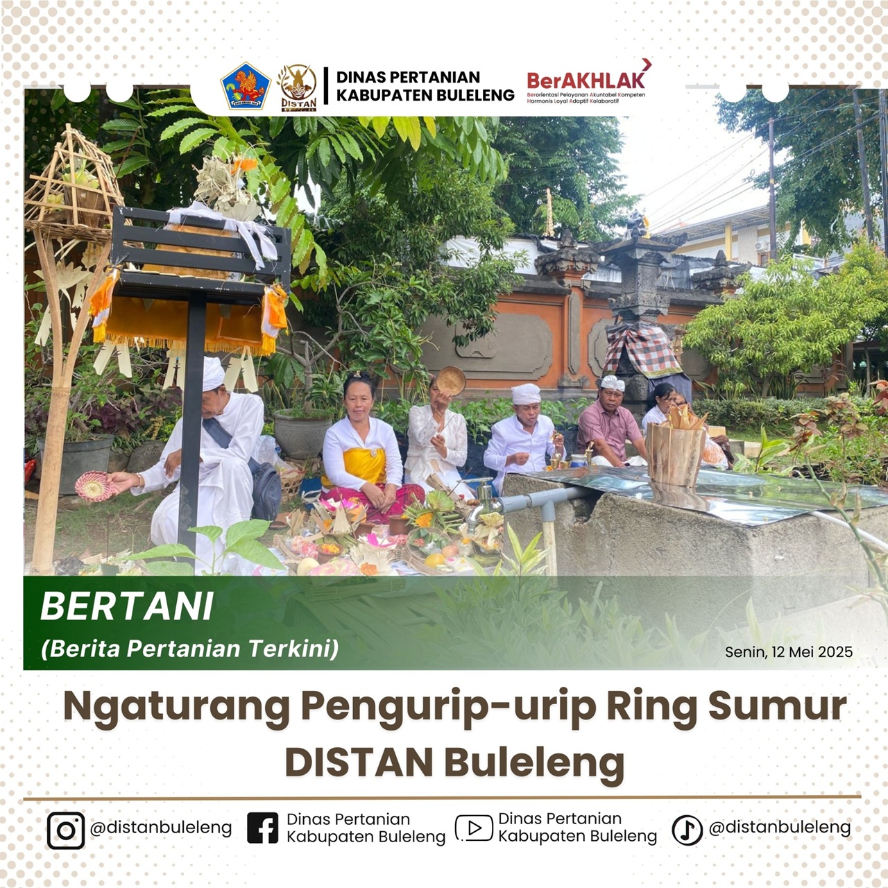 Dinas Pertanian Kabupaten Buleleng melaksanakan upacara sembahyang bersama Meurip-Urip Sumur pada hari suci Purnama Jiyestha, Senin (12/5/25). Upacara ini berlangsung di lingkungan kantor Dinas Pertanian sebagai bentuk penghormatan dan pemuliaan terhadap sumber air, khususnya sumur, yang menjadi elemen vital dalam kegiatan pertanian.