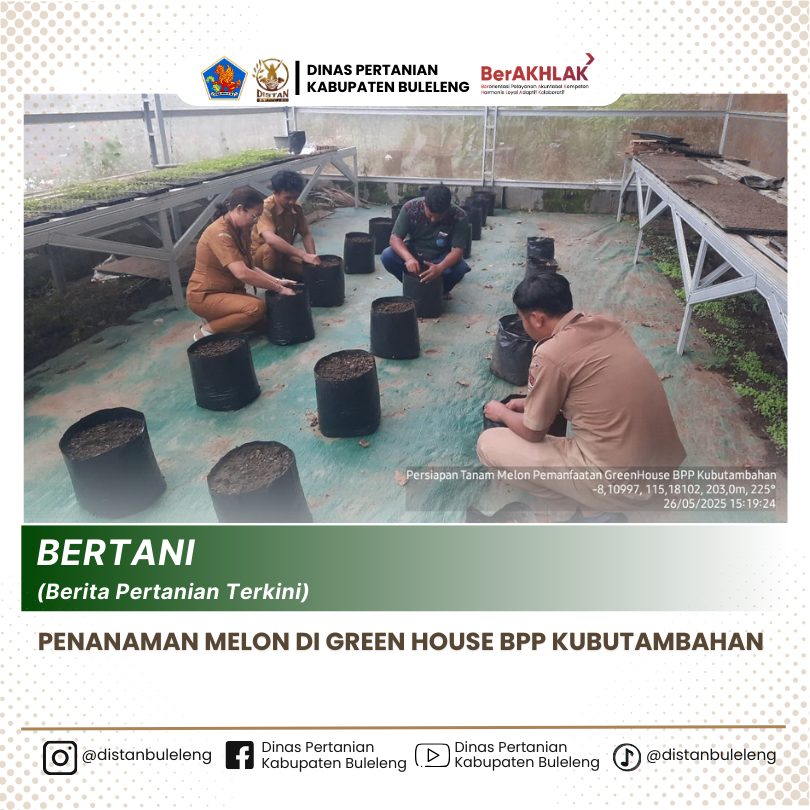 Adapun beberapa keunggulan Berbudidaya melon di dalam green house adalah: bisa melakukan kontrol lingkungan yang lebih baik,proteksi hama dan penyakit lebih intensif,serta potensi peningkatan hasil panen..pada kesempatan ini karyawan dan karyawati BPP Kubutambahan mencoba melakukan budidaya tanaman melon di dalam green house yg ada di BPP Kubutambahan,dengan sistem penanaman yaitu tanam benih langsung ( Tabela), varietas yang ditanam yaitu : Golden Melo,tentunya varietas yang cocok dengan agroklimat setempat.