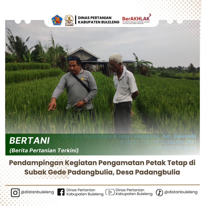 Kamis, 10 April 2025 POPT Kecamatan Sukasada dan PP Wilbin Desa Padangbulia melaksanakan Pendampingan Kegiatan Pengamatan Petak Tetap di Subak Gede Padangbulia, Desa Padangbulia, Kecamatan Sukasada, Kabupaten Buleleng, Bali. Pada pelaksanaan kegiatan tersebut turut serta didampingi oleh POPT Kecamatan Sukasada, PP Desa Padangbulia, bersama Kelian Subak dan Petani.