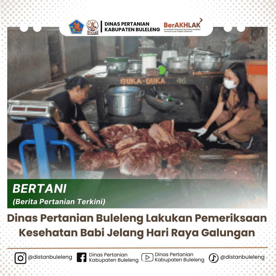 Menjelang perayaan Hari Raya Galungan dan Kuningan, Dinas Pertanian Bidang peternakan dan Kesehatan Hewan Kabupaten Buleleng melakukan pemeriksaan kesehatan hewan, khususnya babi, yang akan digunakan dalam upacara keagamaan dan konsumsi masyarakat. Pemeriksaan ini dilakukan sebagai langkah antisipatif untuk menjamin keamanan pangan serta mencegah penyebaran penyakit hewan, seperti African Swine Fever (ASF).