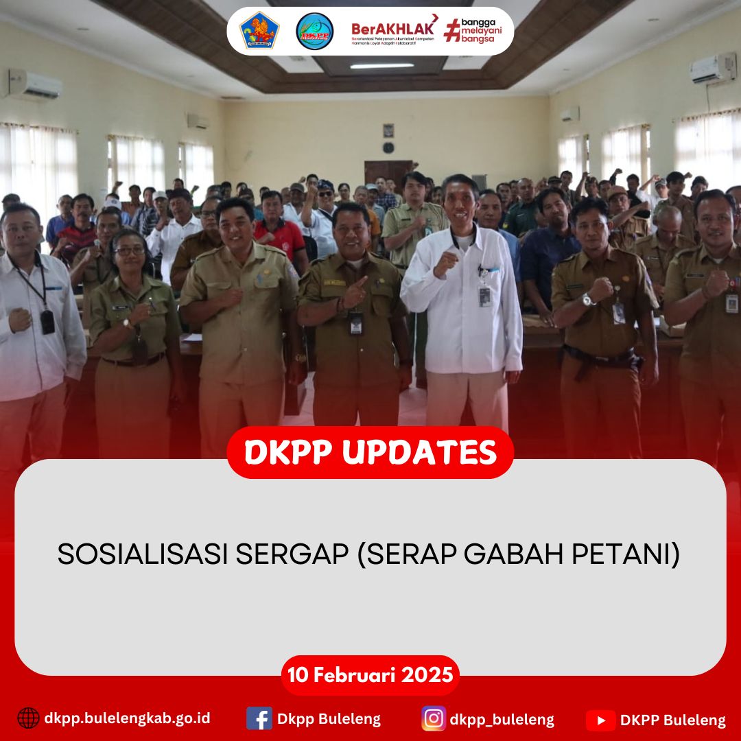Senin, 10 Februari 2025 - Dinas Ketahanan Pangan dan Perikanan (DKPP) Kabupaten Buleleng menghadiri Sosialisasi Sergap (Serap Gabah Petani) yang bertempat di Dinas Pertanian Kab. Buleleng. Kegiatan dipimpin Kadis Pertanian Buleleng serta dihadiri perwakilan Perum. BULOG, Kabid Distribusi dan Cadangan Pangan DKPP Buleleng (Ir. Ida Bagus Wirama), dan unsur terkait lainnya.