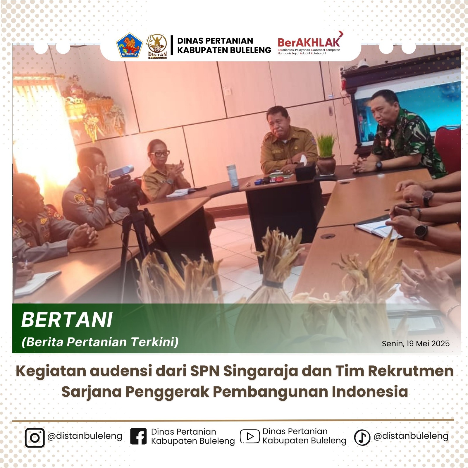19 Mei 2025, Kegiatan audensi dari SPN Singaraja dan Tim Rekrutmen Sarjana Penggerak Pembangunan Indonesia dengan Kepala dinas Pertanian Kab.Buleleng bertempat di ruang kerja kepala dinas pertanian kab.buleleng, peserta audensi : Tim Rekrutmen Sarjana Penggerak Pembangunan Indonesia ( Mayor TNI AL Yudi Sugiantoro, didampingi dari SPN Singaraja Bapak Semadi dan Bapak Sueca, dan dari Dinas Pertanian Kab.Buleleng diterima langsung oleh kepala dinas pertanian Buleleng (Gede Melandrat,SP) di Dampingi Para Kabid dan perencana, pada kesempatan pertama, Kepala Dinas Pertanian Kabupaten Buleleng menjelaskan potensi Pertanian di Buleleng dan selanjutnya Bapak Yudi Sugiantoro menyampaikan maksud dan Tujuan beraudensi yaitu : dalam rangka melaksanakan pelatihan manajerial SPPI Tani Nusantara , ingin melakukan kerjasama dengan dinas pertanian buleleng untuk melaksanakan praktik Budidaya pertanian langsung di lapangan yang berada di lahan ek hutan kota di Banyuasri dan sekaligus memohon dapat menugaskan 5 orang narasumber (Praktisi) untuk mengajar anak-anak sarjana yang kebetulan saat ini sebagai siswa di SPN Singaraja sebanyak 403 orang , dan adapun materi dan Praktik Lapangan Kegiatan Tani Nusantara yang akan di laksanakan adalah : 1. Pembuatan Mikroba, Mikoriza dan aplikasi, 2. Pembuatan Irigasi , Sprinkler apliksi, 3. pembuatan irigasi Droping Pipa, Rain Gun Aplikasi, 4. Pembuatan Irigasi Drip, rain Hose, dan aplikasi, 5. Pestisida dan aplikasi, 6. Pupuk dan Aplikasi, 7. Pengolahan lahan dan Pembuatan bedengan, 8. Pembuatan bibit dan pindah tanam, dan lebih lanjut Kepala dinas pertanian kab.buleleng memberitanggapan bahwasanya Dinas Pertanian Kab.Buleleng menyambut baik kegiatan ini dan siap untuk berkolaborasi serta siap untuk menjadi Narasumber dan Praktisi.
