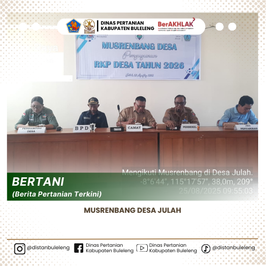 Tejakula, 25 Agustus 2025, penyuluh wilbin Pacung dan Julah mengikuti Musrebang Desa Julah yang dilaksanakan di ruang pertemuan Desa Julah, di mana Musrenbang Desa (Musyawarah Perencanaan Pembangunan Desa) adalah forum musyawarah tahunan di tingkat desa yang melibatkan pemerintah desa, BPD (Badan Permusyawaratan Desa), serta masyarakat desa untuk menyusun rencana pembangunan desa, pelaksanaan Musrenbang Desa di Desa Julah di hadiri oleh Camat Tejakula yang diwakili oleh kasi Pembangunan, Perbekel, Jro Penyarikan, Ketua BPD, Pedamping Desa, Babinsa, staf/pegawai pemdes desa, penyuluh pertanian, bidan desa, para kadus dan pada tokoh Masyarakat Desa Julah, acara dibuka langsung oleh perbekel, dilanjutkan penyampaian dari Bendesa Adat, penyuluh pertanian, bidan desa, dan pendamping desa, dimana tuajannya;