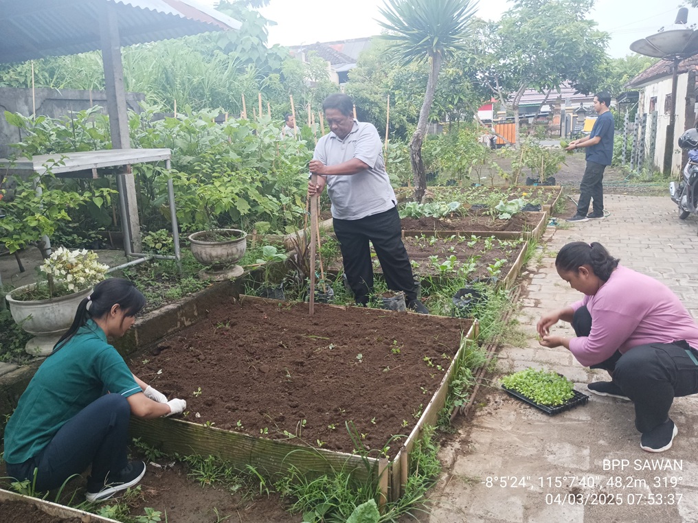 Seluruh pegawai di BPP Sawan melaksanakan kegiatan pembersihan di halaman kantor dan pemeliharaan tanaman dengan mencabuti rumput liar yang tumbuh disekitar tanaman kemudian dilanjutkan dengan melakukan penanaman bibit pakcoy ke lahan yang sudah disiapkan.