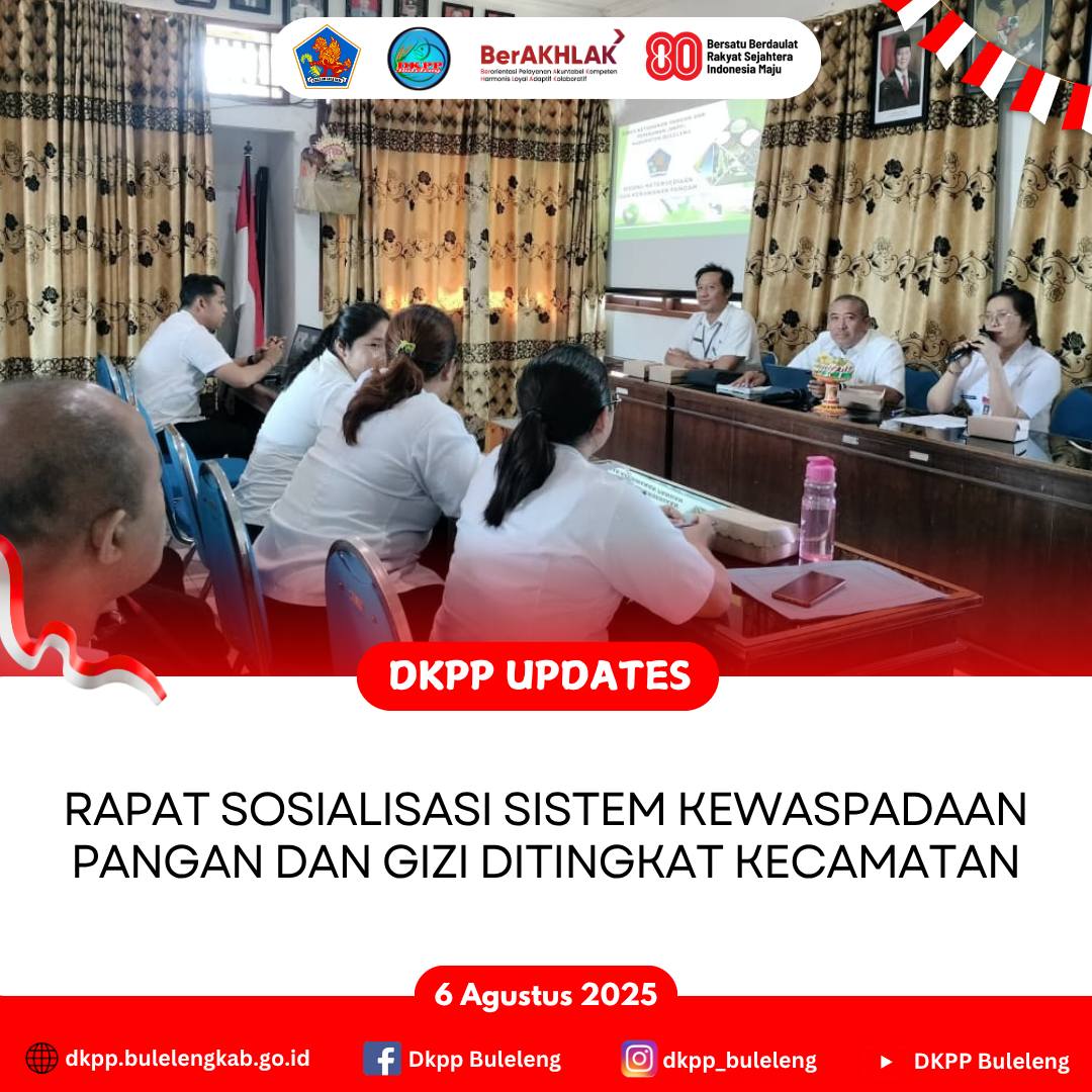 Rabu, 6 Agustus 2025 - Dinas Ketahanan Pangan dan Perikanan (DKPP) Kabupaten Buleleng melalui Bidang Ketersediaan dan Kerawanan Pangan menggelar Rapat Sosialisasi Sistem Kewaspadaan Pangan dan Gizi (SKPG) berlokasi di Kecamatan Seririt. Rapat dipimpin Kepala Bidang Ketersediaan dan Kerawanan Pangan DKPP Buleleng (drh. I Wayan Susila) bersama Analis Ketahanan Pangan, serta dihadiri Sekretaris Camat Seririt, dan dihadiri oleh perwakilan masing - masing desa / kelurahan setempat.