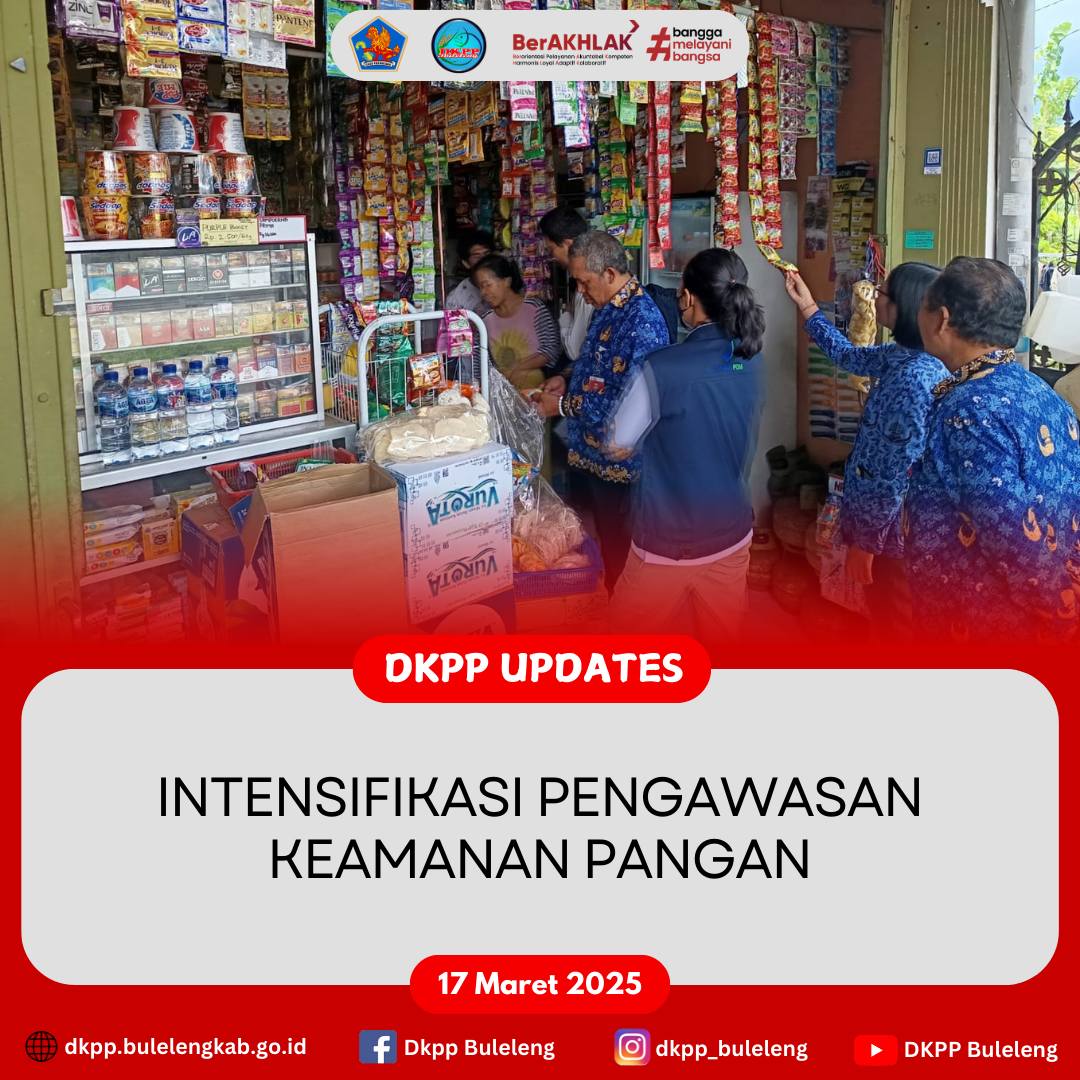 Senin, 17 Maret 2025 - Dinas Ketahanan Pangan dan Perikanan (DKPP) Kabupaten Buleleng bersama Loka POM Buleleng dan instansi lintas sektor melaksanakan Intensifikasi Pengawasan Keamanan Pangan pada serangkaian bulan Ramadhan dan menjelang Idul Fitri 2025.