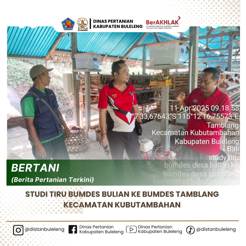 Pada Jumat, 11 April 2025 Direktur Bumdes Bulian didampingi Penyuluh Pertanian Wilbin Bulian melakukan studi tiru ke Bumdes Tamblang yang diterima langsung oleh Perbekel Tamblang dan Direktur Bumdes Tamblang terkait usaha peternakan ayam petelur karena penggunaan dana desa Bulian Tahun 2025 dialokasikan untuk membuka usaha ayam petelur.