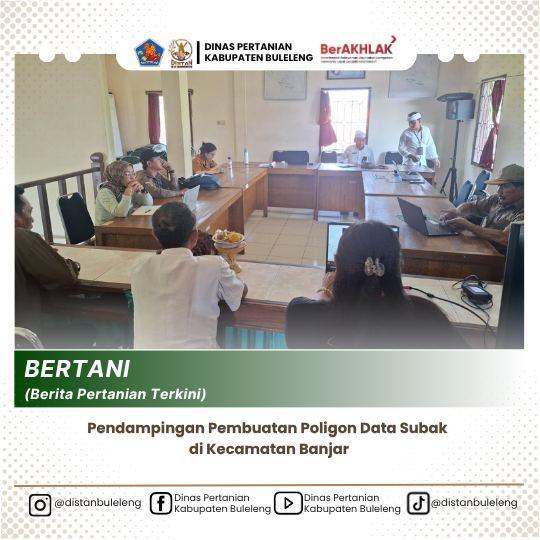 Pada hari Senin, 6 Oktober 2025, telah dilaksanakan kegiatan pendampingan dalam pembuatan poligon data subak yang berada di bawah naungan Balai Penyuluh Pertanian (BPP) Kecamatan Banjar. Kegiatan ini bertempat di kantor BPP Kecamatan Banjar dan dihadiri oleh para penyuluh pertanian yang bertugas di wilayah tersebut.