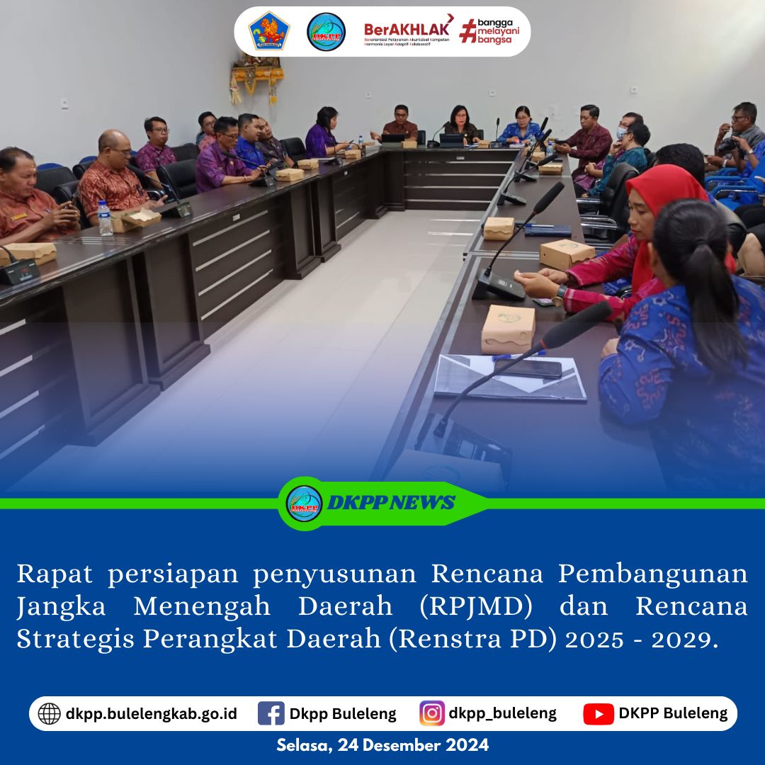 Bertempat di Ruang Rapat Utama Badan Perencanaan Pembangunan Daerah (Bappeda) Kabupaten Buleleng, Dinas Ketahanan Pangan dan Perikanan (DKPP) Kabupaten Buleleng menghadiri Rapat persiapan penyusunan Rencana Pembangunan Jangka Menengah Daerah (RPJMD) dan Rencana Strategis Perangkat Daerah (Renstra PD) 2025 - 2029.