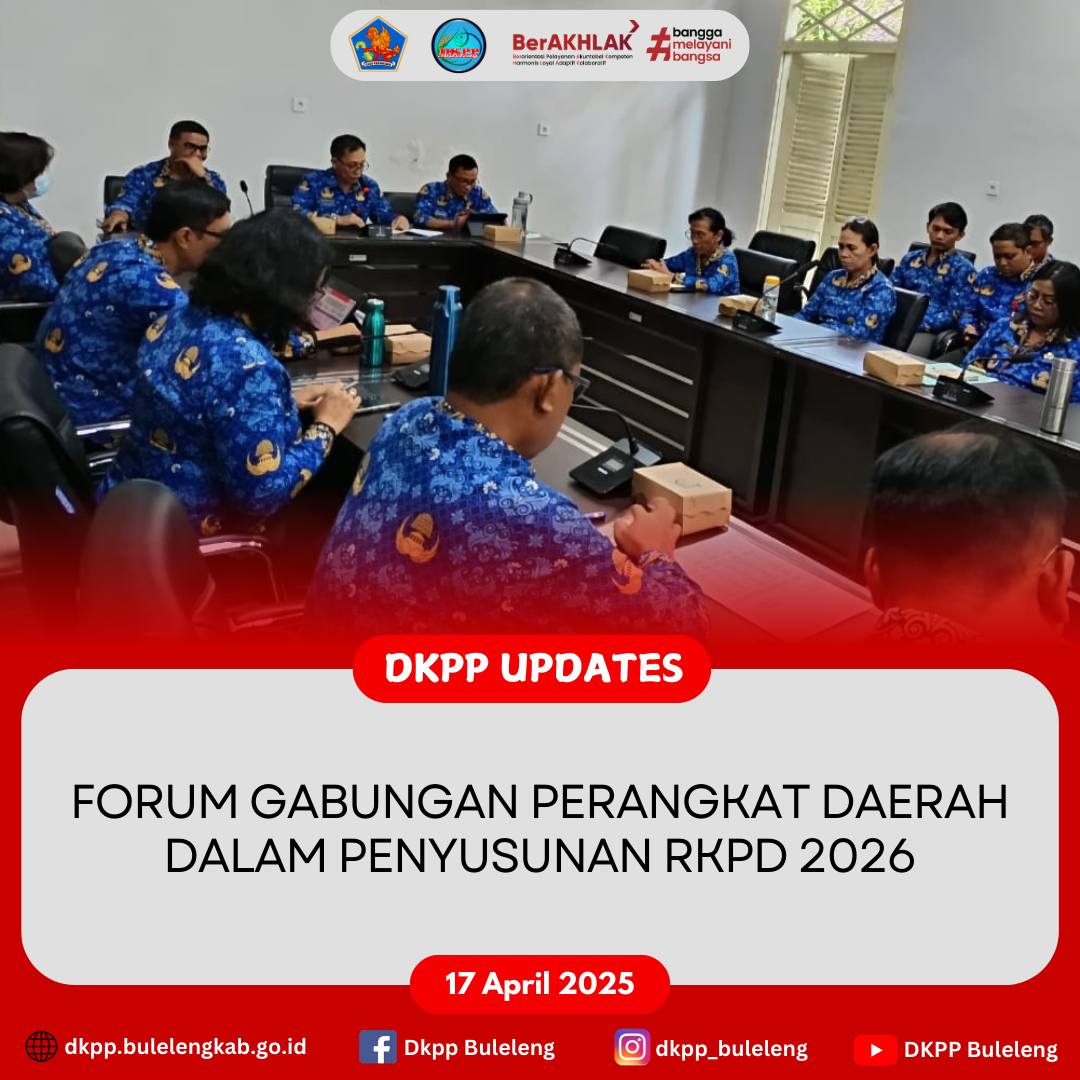 Kamis, 17 April 2025 - Dinas Ketahanan Pangan dan Perikanan (DKPP) Kabupaten Buleleng menghadiri Forum Gabungan Perangkat Daerah dalam rangka penyusunan Rencana Kerja Pemerintah Daerah (RKPD) Tahun 2026 yang bertempat di Ruang Rapat Bappeda Buleleng. Rapat dibuka oleh Asisten Pemerintahan dan Kesejahteraan dan dihadiri para Pimpinan Instansi Perangkat Daerah lingkup Pemkab Buleleng bersama Perencana.