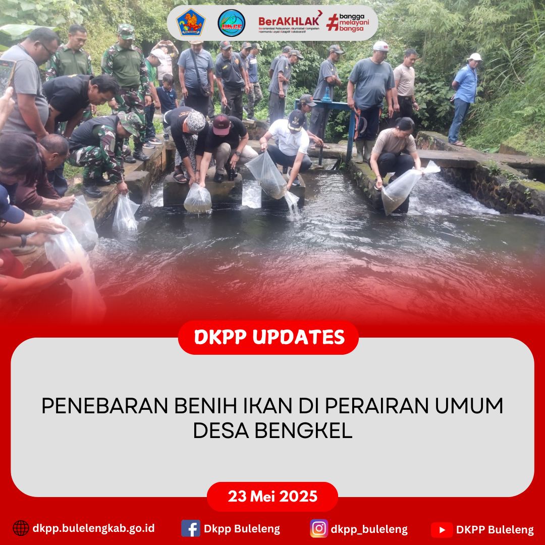 Jumat, 23 Mei 2025 - Dinas Ketahanan Pangan dan Perikanan (DKPP) Kabupaten Buleleng bersama UPTD Balai Perbenihan Ikan (BPI) mengikuti serangkaian kegiatan Jumat Bersih dan Penebaran Benih pada perairan umum di Desa Bengkel, Kecamatan Busungbiu. Kegiatan dihadiri instansi / lembaga terkait, serta tokoh masyarakat dan masyarakat umum setempat.