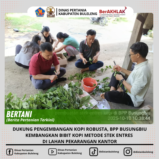 Pada hari Jumat, 10 Oktober 2025, Seluruh karyawan Balai Penyuluhan Pertanian (BPP) Busungbiu melaksanakan kegiatan pembuatan bibit kopi melalui metode stek entres yang bertempat di lahan pekarangan kantor BPP Busungbiu. Kegiatan ini merupakan salah satu upaya nyata dalam mendukung pengembangan perkebunan kopi di wilayah Busungbiu, sekaligus sebagai bentuk penerapan teknologi perbanyakan vegetatif yang efisien dan berkelanjutan.