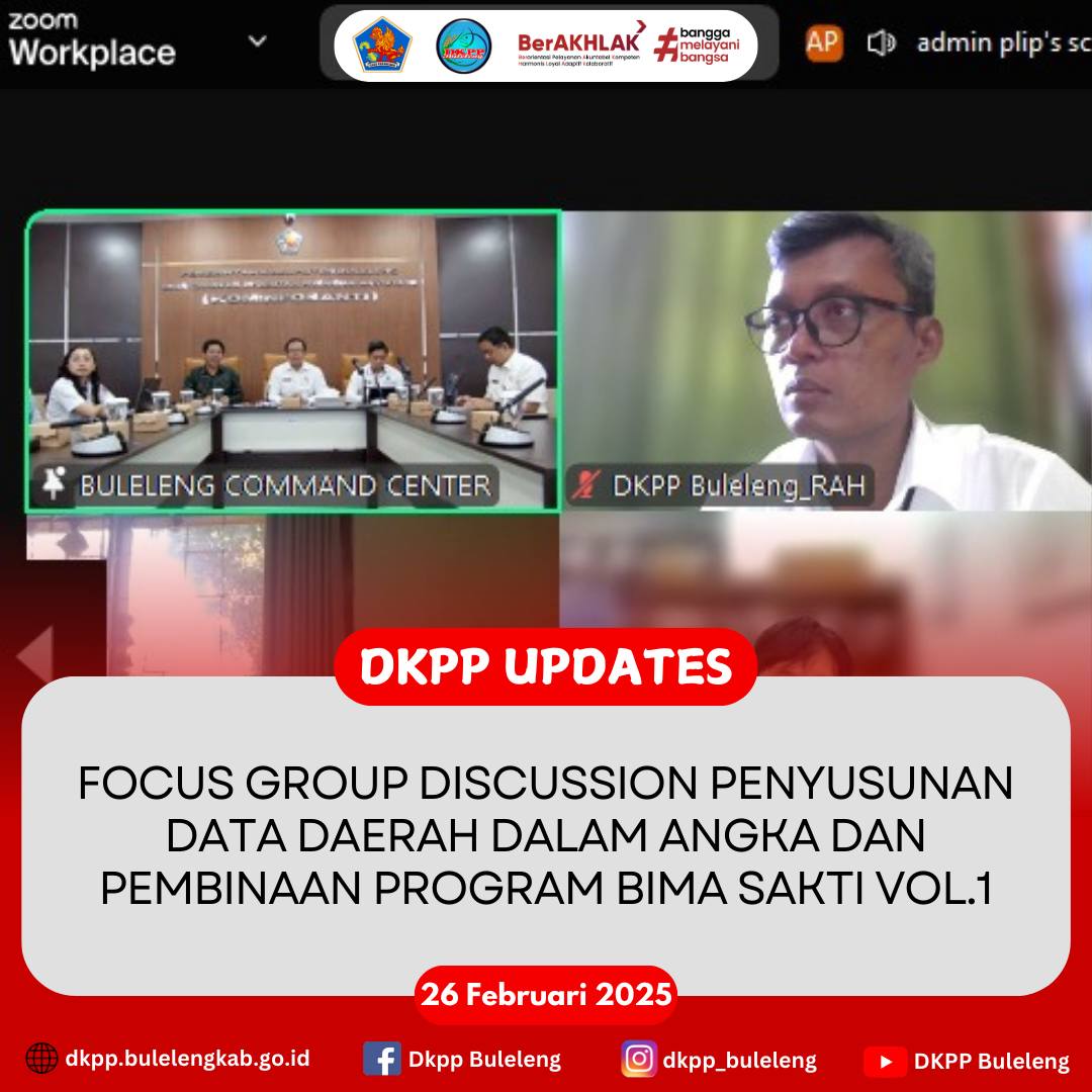 Rabu, 26 Februari 2025 - Dinas Ketahanan Pangan dan Perikanan (DKPP) Kabupaten Buleleng mengikuti Focus Group Discussion (FGD) Penyusunan Data Daerah Dalam Angka (DDA) Tahun 2025 dan Pembinaan Program Bima Sakti Vol.1 yang diselenggarakan Badan Statistik Kabupaten Buleleng melalui Zoom Meeting.