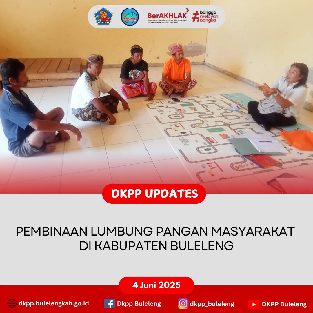Rabu, 4 Juni 2025 - Dinas Ketahanan Pangan dan Perikanan (DKPP) Kabupaten Buleleng melalui Bidang Distribusi dan Cadangan Pangan melakukan pembinaan terkait Lumbung Pangan Masyarakat (LPM) pada LPM Kembang Sari, Desa Joanyar, Kecamatan Seririt. Kegiatan dilaksanakan oleh Analis Ketahanan Pangan (Nyoman Sukerni, S.H., M.Pd) bersama staf, dan dihadiri anggota serta pengurus LPM. Pembinaan ini bertujuan untuk melihat perkembangan dana LPM serta memantau stok Gabah dan Beras yang tersedia.