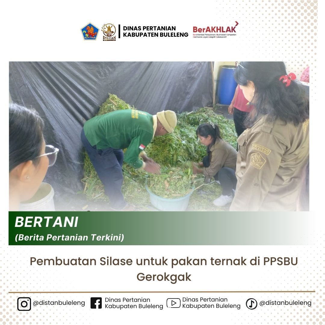 Silase merupakan pakan ternak yang diawetkan melalui proses fermentasi anaerob, biasanya menggunakan bahan hijauan seperti rumput gajah, dan tanaman legum. Proses ini mampu menjaga kandungan nutrisi pakan sehingga tetap tersedia sepanjang tahun. Dalam Pembuatan silase yang dilaksanakan bersama dengan tenaga teknis PPSBU Gerokgak membuat pakan silase sebanyak 390 hijuan dan menggunakan 10 kg dedak. Dalam kegiatan ini, para petugas teknis mempraktikkan langsung proses pembuatan silase, mulai dari pemilihan bahan baku, pencacahan, penambahan bahan lainya, hingga proses fermentasi dalam silo sederhana.