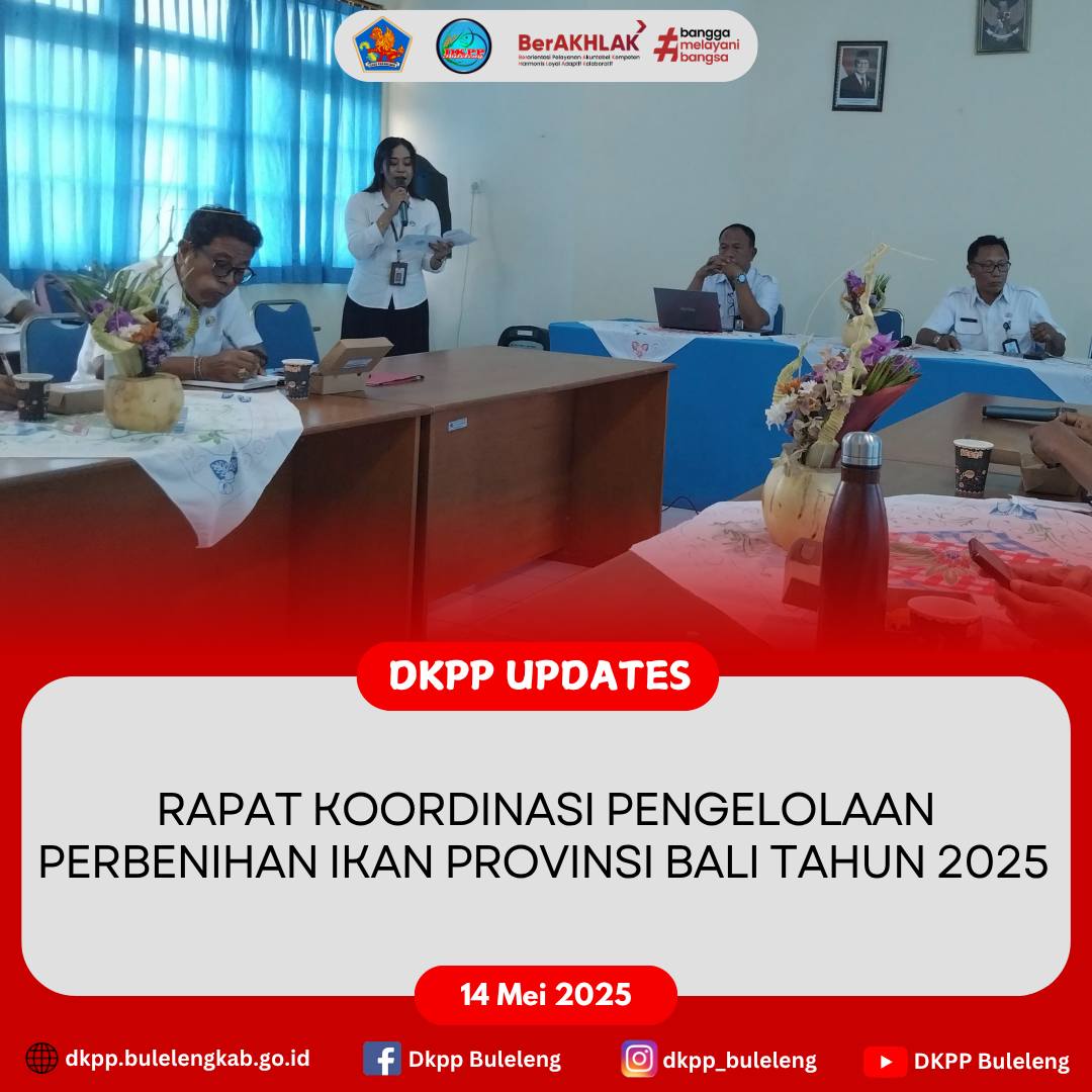 Rabu, 14 Mei 2025 - Dinas Ketahanan Pangan dan Perikanan (DKPP) Kabupaten Buleleng melalui UPTD Balai Perbenihan Ikan (BPI) menghadiri Rapat Koordinasi Pengelolaan Perbenihan Ikan Provinsi Bali Tahun 2025 bertempat di Ruang Rapat Balai Benih Ikan Sentral Sangeh, Kabupaten Badung.
