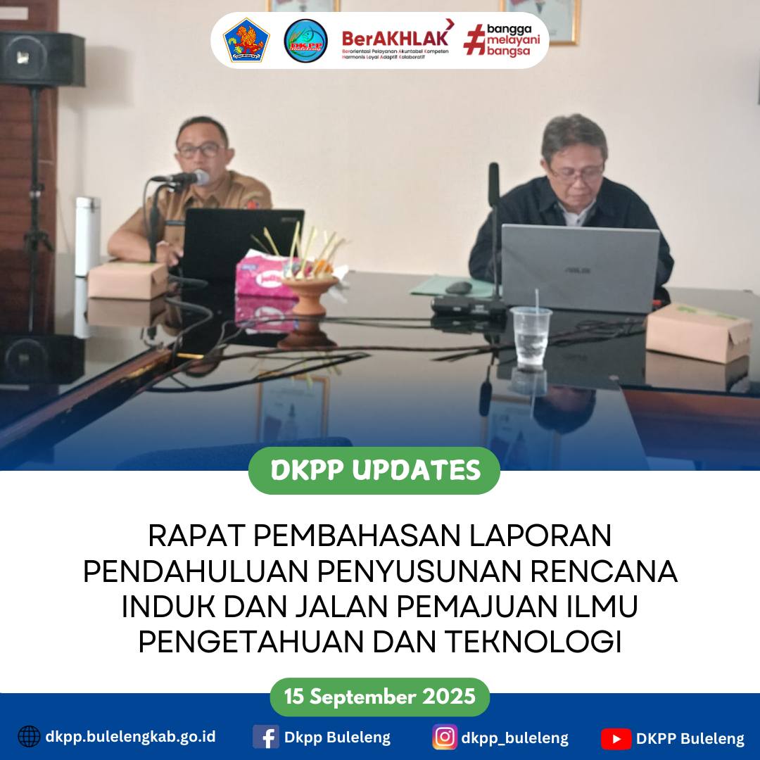 Senin, 15 September 2025 - Sekretaris Dinas Ketahanan Pangan dan Perikanan Kabupaten Buleleng Ariston Adhi Pamungkas, S.P., M. Env Man. menghadiri Rapat Pembahasan Laporan Pendahuluan Penyusunan Rencana Induk dan Peta Jalan Pemajuan Ilmu Pengetahuan dan Teknologi Kab. Buleleng bertempat di Ruang Rapat Badan Riset dan Inovasi Daerah (BRIDA) Kab. Buleleng. Pertemuan dipimpin langsung oleh Kepala Brida Buleleng, serta dihadiri Tim Peneliti Undiksha, Tim Penjamin Mutu, dan SKPD terkait.
