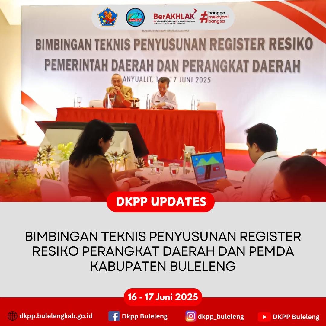 Sekretaris Dinas Ketahanan Pangan dan Perikanan Kabupaten Buleleng Ariston Adhi Pamungkas, S.P., M. Env Man. didampingi Perencana mengikuti Bimbingan Teknis Penyusunan Register Resiko Perangkat Daerah dan Pemda Kabupaten Buleleng terkait RPJMD 2026 - 2030 bertempat di Banyualit Hotel pada 16 & 17 Juni 2025. Dalam kegiatan Bimtek ini, para hadirin ditugaskan untuk menyusun Register Resiko yang ada di Instansi Perangkat Daerah, terutama yang berkaitan dengan Sasaran Strategis masing - masing instansi.