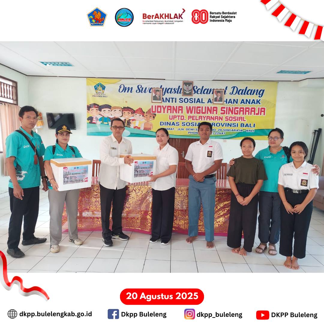 Rabu, 20 Agustus 2025 - Kepala Dinas Ketahanan Pangan dan Perikanan Kabupaten Buleleng I Gede Putra Aryana, S.Sos., MAP yang mewakili Bupati Buleleng melaksanakan Program DKPP Berbagi berupa Pembagian Daging Ikan Tuna Segar kepada 21 Panti Asuhan di Buleleng. Giat ini merupakan serangkaian HUT Kemerdekaan Republik Indonesia ke-80 Tahun 2025. Kegiatan ini juga sebagai bentuk implementasi GEMARIKAN (Gerakan Memasyarakatkan Makan Ikan) untuk mewujudkan generasi sehat dan cerdas.