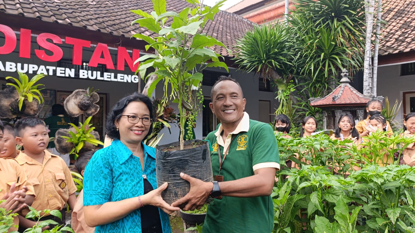 Kegiatan diakhiri dengan serah terima langsung tanaman terong dalam polybag dari Dinas Pertanian Kabupaten Buleleng kepada siswa dan guru pendamping SD Negeri 4 Banyuasri.