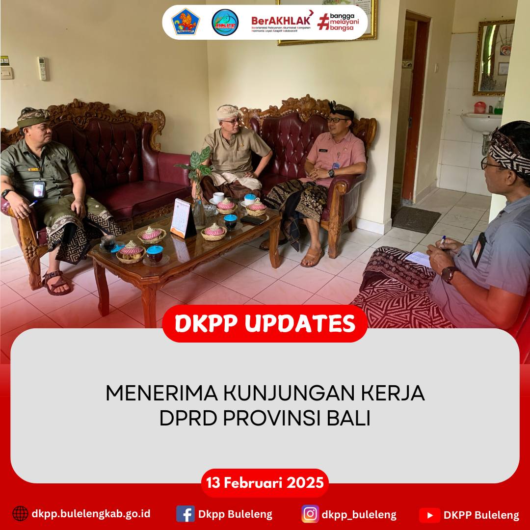 Kamis, 13 Februari 2025 - Kepala Dinas Ketahanan Pangan dan Perikanan (DKPP) Kabupaten Buleleng I Gede Putra Aryana, S.Sos., MAP. bersama Kabid Pemberdayaan Masyarakat Perikanan menerima dan memfasilitasi kunjungan kerja Tim DPRD Provinsi Bali dalam rangka pengawasan mengenai pelaksanaan program pemerintah daerah serta untuk mengetahui pengembangan potensi di Bidang Kelautan dan Perikanan di Kabupaten Buleleng.