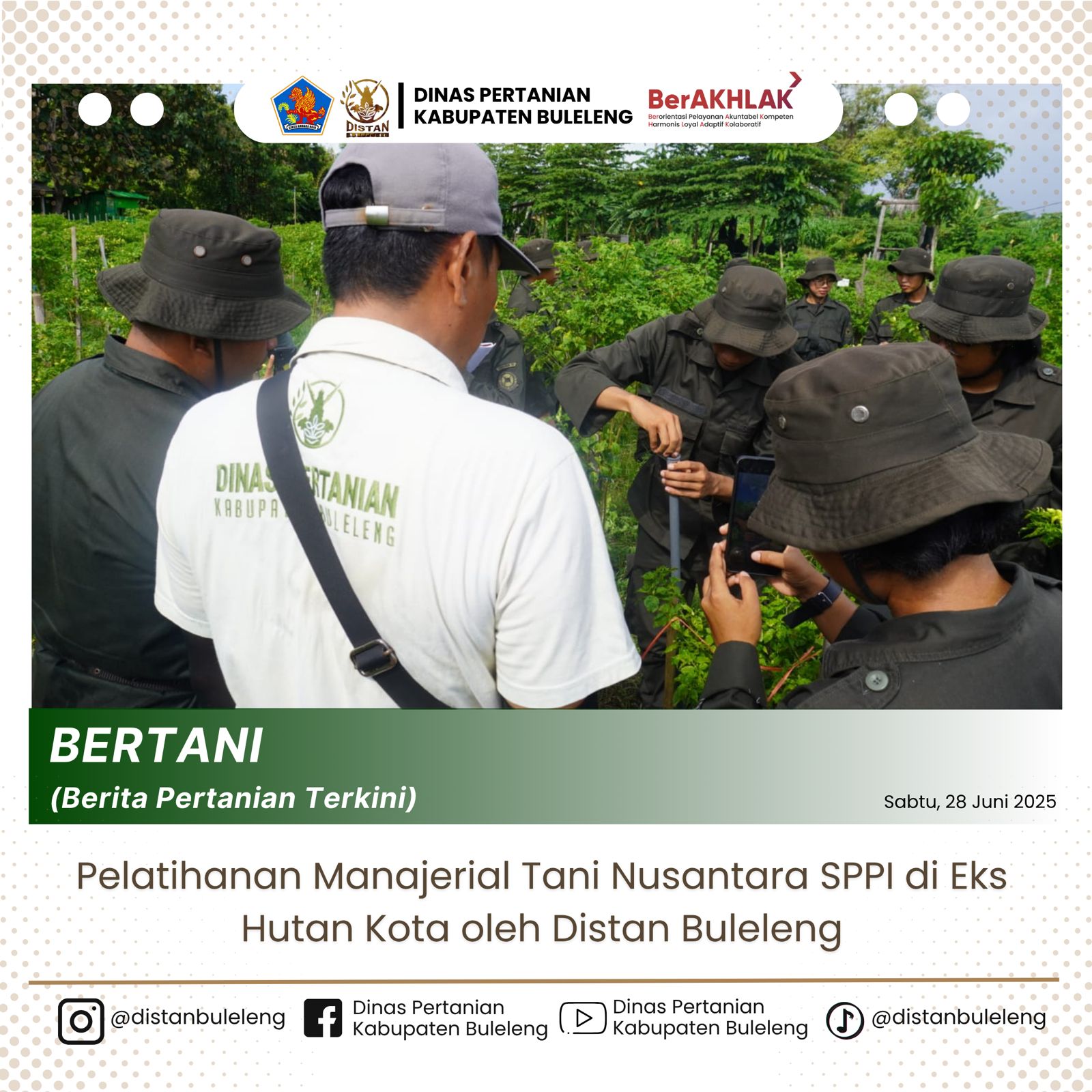 Singaraja, 28 Juni 2025 — Dinas Pertanian Kabupaten Buleleng kembali melanjutkan rangkaian Pelatihan Manajerial Tani Nusantara, yang kini memasuki pertemuan ke-11. Kegiatan yang dilaksanakan pada hari ini difokuskan pada praktik lapangan, dengan topik utama penerapan sistem irigasi sprinkler dan pembersihan gulma. Lokasi kegiatan bertempat di lahan eks Hutan Kota Singaraja yang kini dimanfaatkan sebagai area percontohan edukatif.