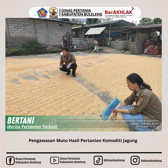 Pengawasan Mutu Hasil Pertanian Komoditi Jagung pada tingkat pelaku usaha di Desa Pengulon dan Desa Patas, Kecamatan Gerokgak oleh Pengawas Mutu Hasil Pertanian (PMHP) Bidang Tanaman Pangan bersama PPL Wilbin. Tujuan pengawasan mutu hasil pertanian komoditi jagung di tingkat pelaku usaha adalah untuk memastikan bahwa setiap tahapan penanganan, penyimpanan, dan pemasaran jagung memenuhi standar mutu yang telah ditetapkan. Pengawasan mutu dilakukan dalam upaya menjamin kadar air, kebersihan, serta tingkat kerusakan jagung sesuai persyaratan sehingga aman dan layak digunakan oleh konsumen maupun industri. Selain itu, pengawasan mutu dilakukan untuk menekan risiko kontaminasi aflatoksin dan kerusakan selama penyimpanan, sehingga mampu mengurangi kehilangan hasil (losses) dan meningkatkan nilai jual produk. Melalui penerapan prinsip-prinsip penanganan pascapanen yang baik (Good Handling Practices). Kegiatan ini juga mendorong pelaku usaha menghasilkan jagung berkualitas tinggi, konsisten, dan dapat ditelusuri asal-usulnya. Secara keseluruhan, pengawasan mutu mendukung peningkatan daya saing jagung lokal, melindungi konsumen, dan memperkuat sistem ketahanan pangan serta kebijakan pemerintah dalam pemenuhan standar mutu hasil pertanian. Berikut hasil pengawasan di : Desa Pengulon