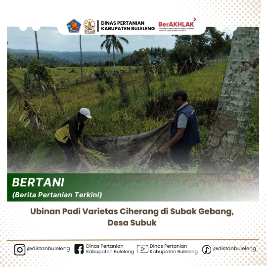Kamis, 15 Mei 2025 telah dilaksanakan kegiatan pengambilan ubinan padi varietas Ciherang di Subak Gebang. Kegiatan ini dilaksanakan oleh PPL Wilbin, Kelian Subak dan petani pemilik lahan.