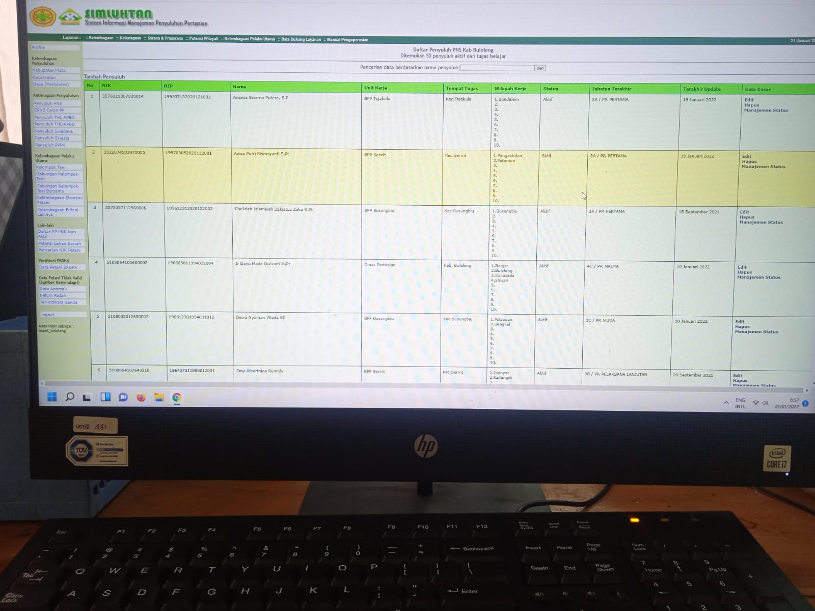 Jumat, 21 Januari 2022, admin Simluhtan Dinas Pertanian Kabupaten Buleleng bertugas memasukkan dan memperbaharui Data Kelembagaan Penyuluhan, Ketenagaan dan Kelembagaan Pelaku Utama ( Kelompok Tani, Gabungan kelompok tani, dan Kelompok Wanita Tani) di wilayahnya, melakukan verifikasi dan validasi data SIMLUHTAN Kabupaten dan Kecamatan secara online setiap bulan.